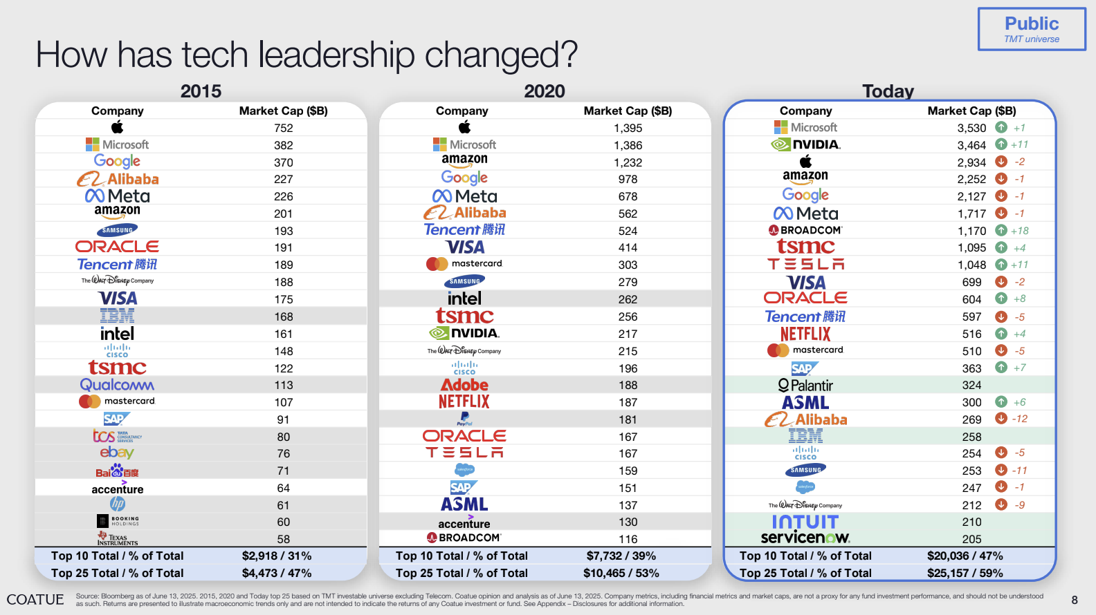 As value consolidates around mega-cap hyperscalers, AI is not just reshaping global tech leadership, it is fueling the rise of the largest companies in history (exhibit below). With power-law dynamics deepening, concentration risk has surged: just ten mega-cap firms, representing 2% of S&P500 constituents, now account for ~40% of the index’s market capitalization, far exceeding Dot-Com era peaks.