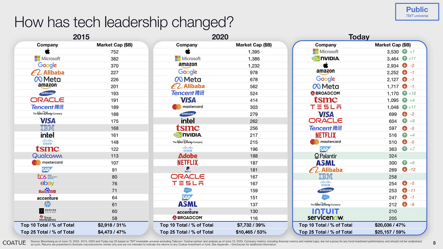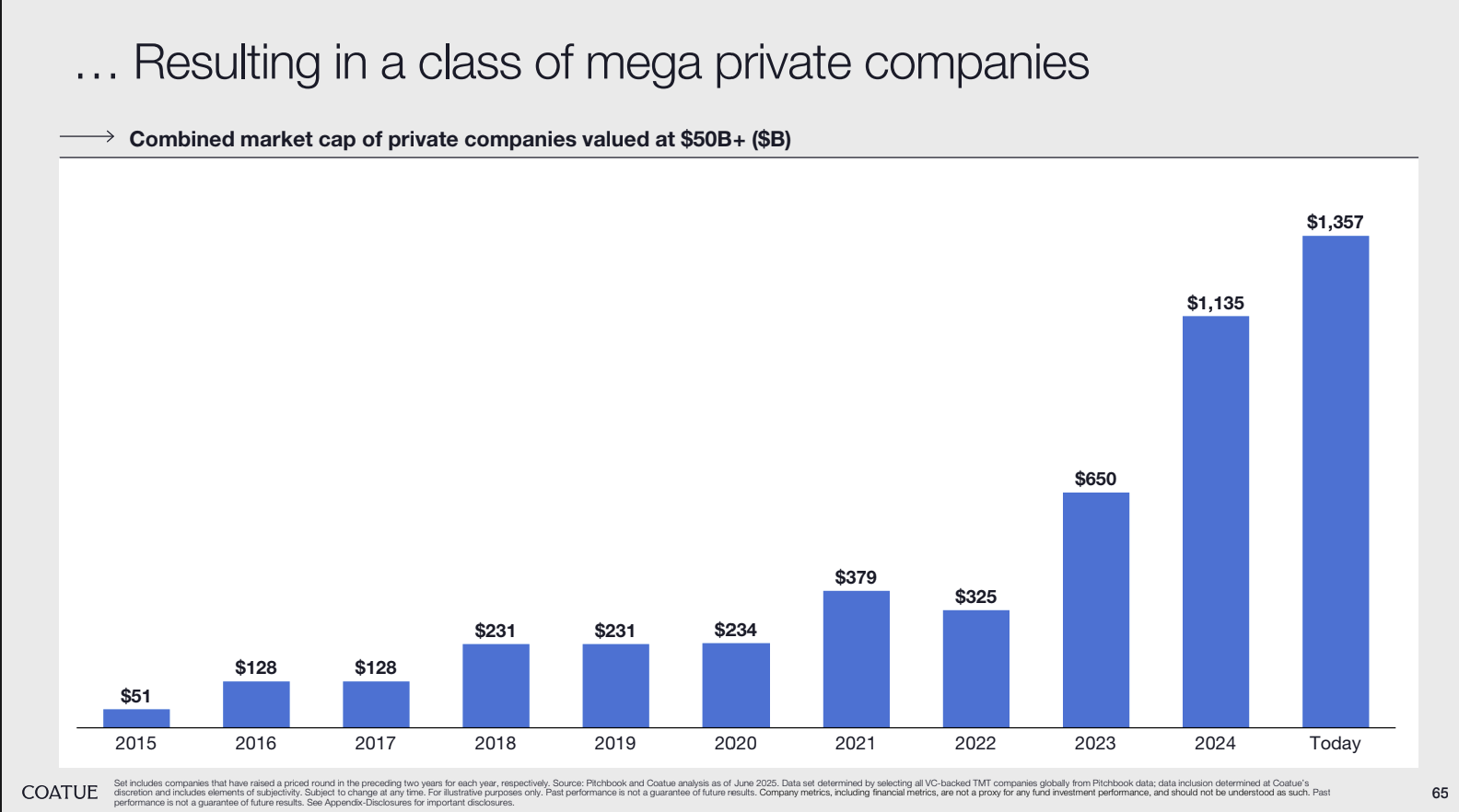 As power-law dynamics become increasingly entrenched, top startups are able to attract outsized capital and stay private for longer. The result is a new class of $50B+ mega-cap private companies: