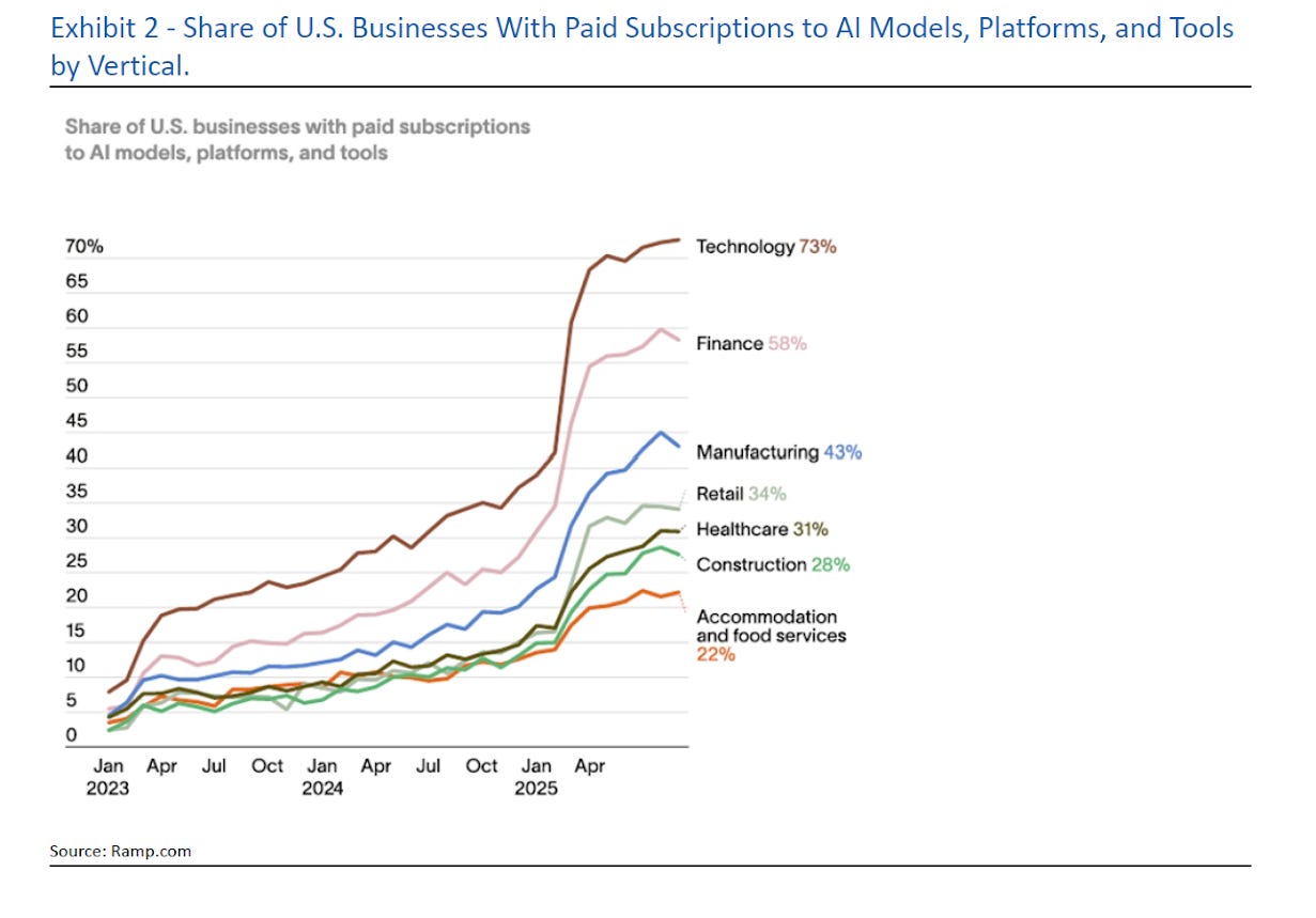 II. AI adoption: As a B2B VC, my focus on this vector of the bubble debate has centered on enterprise AI rather than consumer AI (yes, we all know that ChatGPT is the fastest-growing consumer app in history). Opinions here are sharply divided. Some argue that the pace of enterprise adoption is plateauing (chart below), while others see it accelerating. Forecasts for AI’s impact on productivity and the economy also vary widely. Where you land on this debate largely depends on your fundamental view of total addressable use cases: is AI a one-time innovation shock confined to marginal co-pilot roles, or will autonomous AI agents reshape the landscape? I fall squarely in the latter camp, recognizing that it will take time for an AI-driven future of work to unfold.