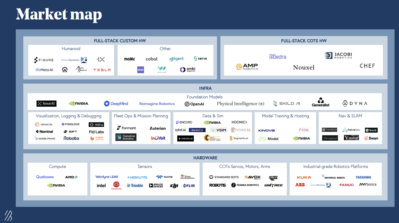 Earlier robotics waves were defined by narrow, pre-programmed machines built for limited (often single) tasks in controlled environments. Today’s AI breakthroughs are enabling general-purpose robots across multiple form factors, capable of learning, adapting, and performing a wide range of real-world tasks in diverse environments. This transition is catalyzing a full rewrite of the robotics stack: from physical AI foundation models that can serve as robotic “brains”, to new data and training paradigms, to novel infra and deployment models for on-device AI, to orchestration software for control and coordination, and even to tightly integrated hardware designed to deliver embodied intelligence at scale: