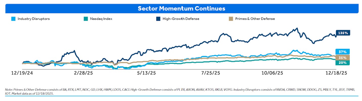 More importantly, this new generation of defense innovators has proven that scaled businesses can be built alongside the legacy primes. In fact, not only did defense as a sector significantly outperform the broader markets in 2025, high-growth defense names were responsible for a big portion of this outperformance: