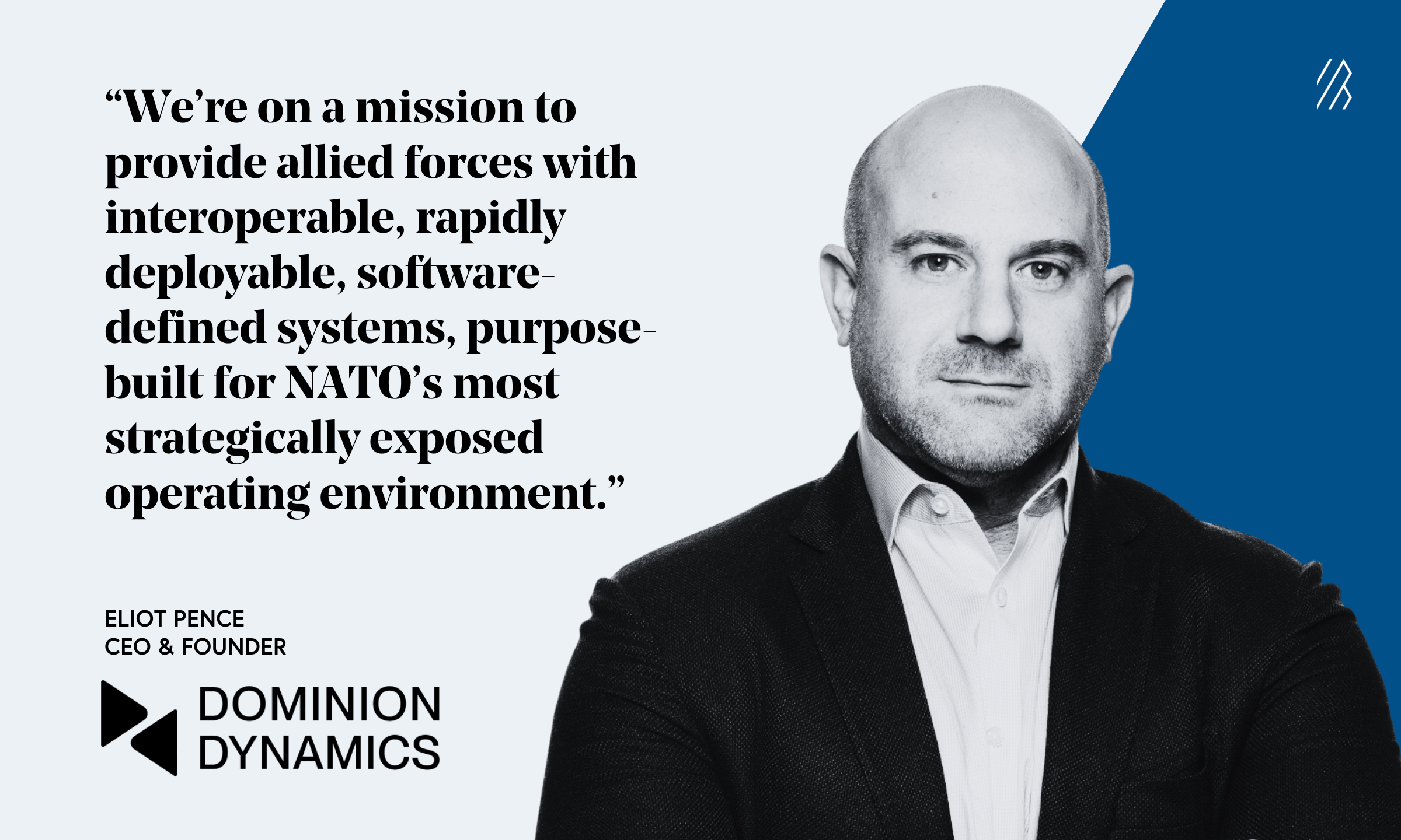 These experiences were key accelerants in inspiring Eliot to found Dominion Dynamics and go after a mission-critical, generational opportunity. Headquartered in Ottawa, Dominion Dynamics aims to modernize Canadian and NATO security capabilities with a suite of AI and advanced technology products purpose-built for extreme operating conditions. Dominion’s vision is to provide the persistent monitoring and data interoperability required not just for Canadian sovereignty, but for the collective security of the NATO alliance.