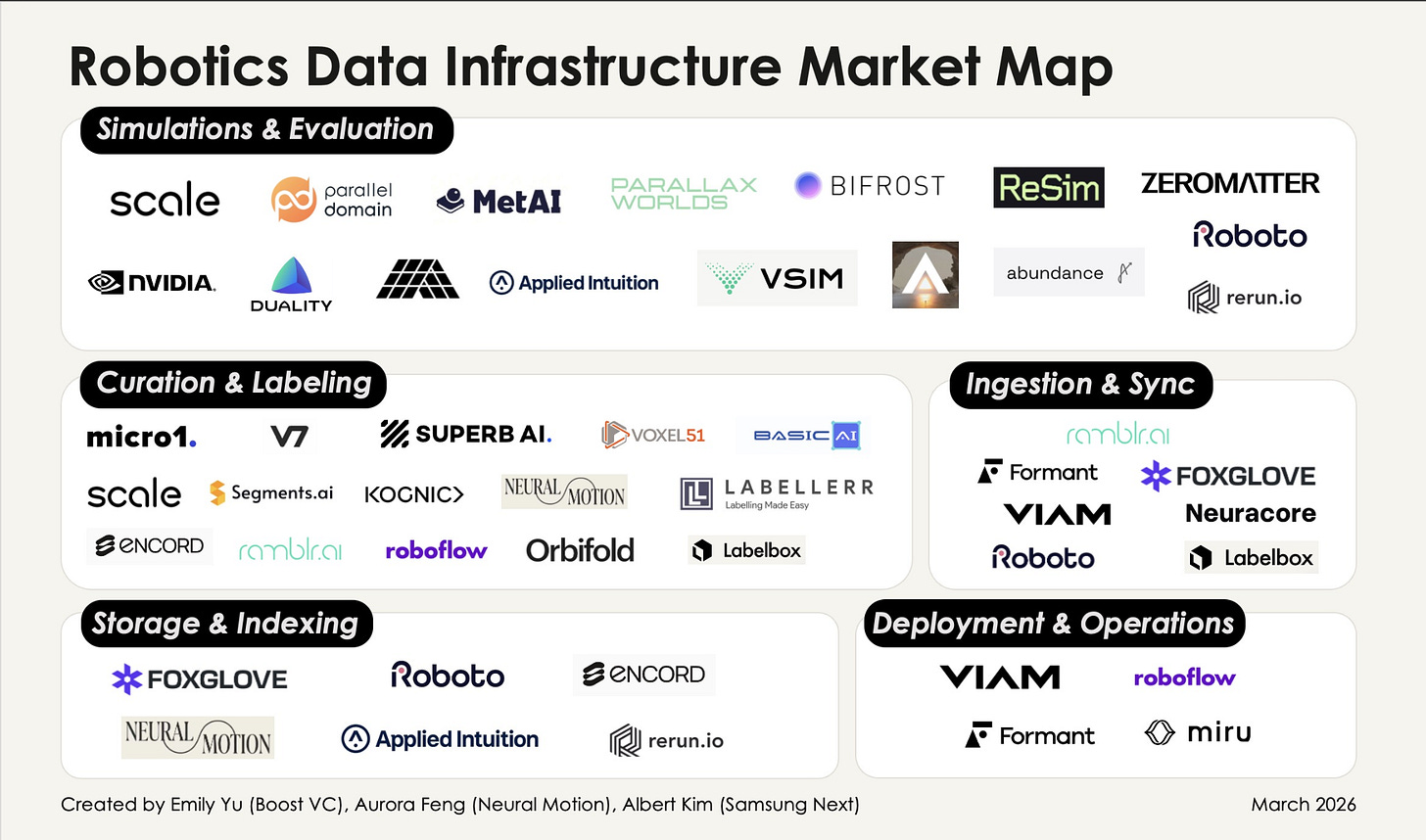 Data bottleneck is easing: For years, the limiting factor on the robotics frontier wasn’t intelligence; it was data. Unlike LLMs, the data required to train robot models (e.g. motor skills, pressure, manipulation, etc.) can’t just be scrapped from the internet. Physical AI data is unstructured, multimodal, and historically expensive and slow to collect via real-world interactions. However, these data constraints are now abating due to advances in scalable teleoperation, simulation-first approaches, egocentric video, world models, and haptics. Additionally, techniques and tooling are also maturing rapidly (exhibit below). The data problem isn’t fully solved yet, but it’s no longer the wall it once was.