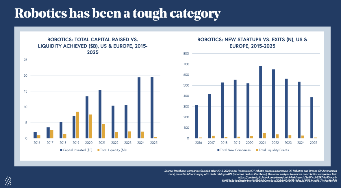 Macroeconomic tailwinds: These technological shifts are converging in a favorable macro environment. Labor shortages, supply chain fragility, and geopolitical pressure around issues like reshoring have shifted automation from a future bet to a present and strategic necessity. At the same time, autonomy is increasingly becoming mainstream in public consciousness, from self-driving cars on our roads to humanoid robots serving customers in restaurants.