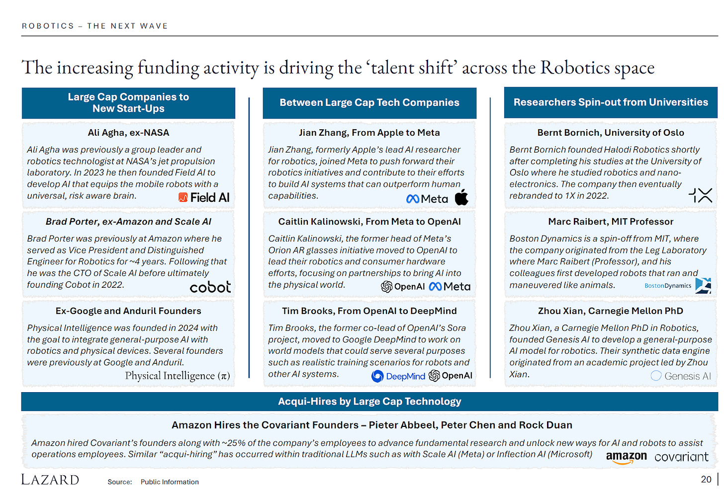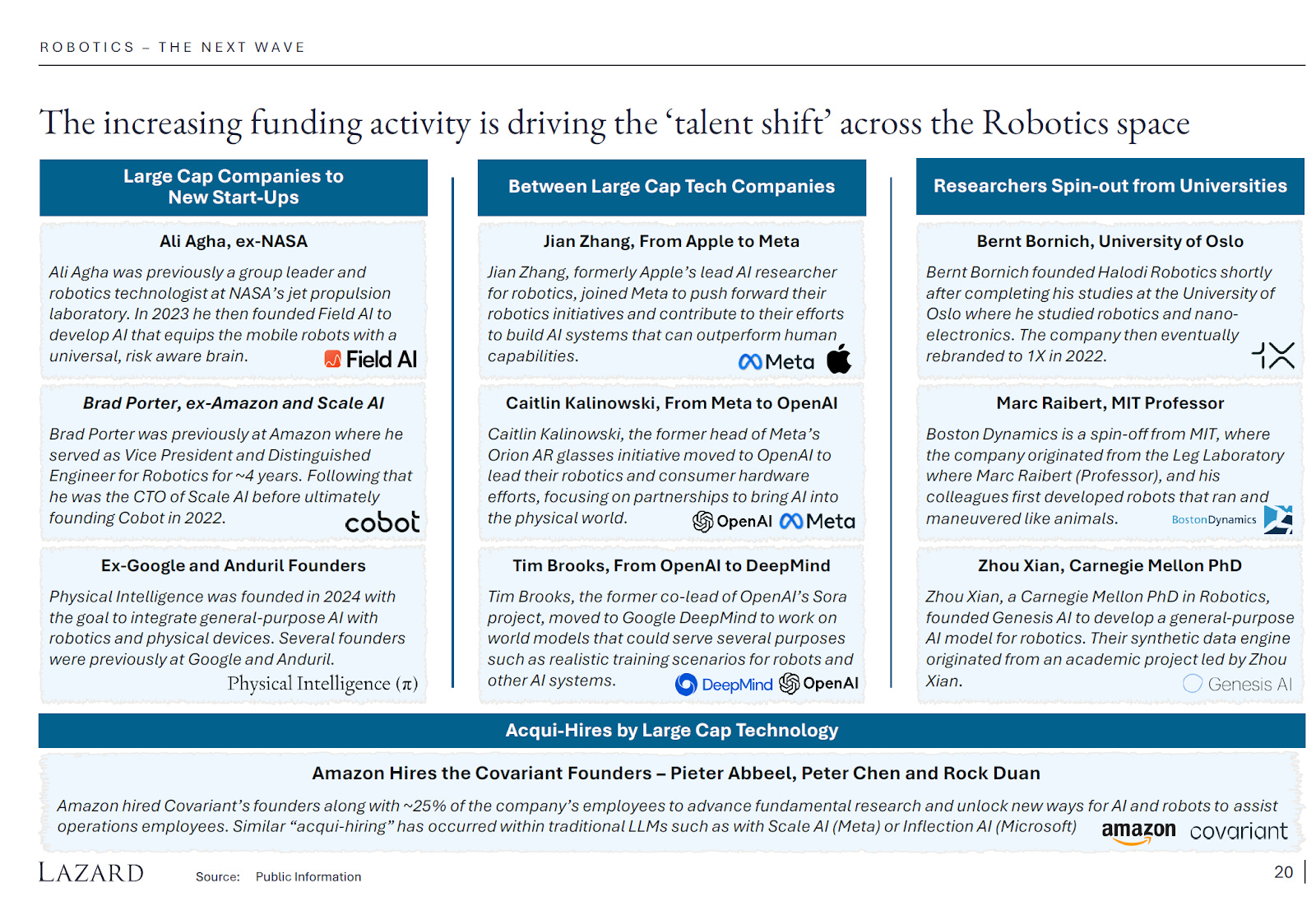Talent inflows: Perhaps the most telling signal of all is talent. Across Big Tech and startups, a wave of researchers, developers, and founders are now moving into the robotics field in numbers reminiscent of the early days of the LLM boom: