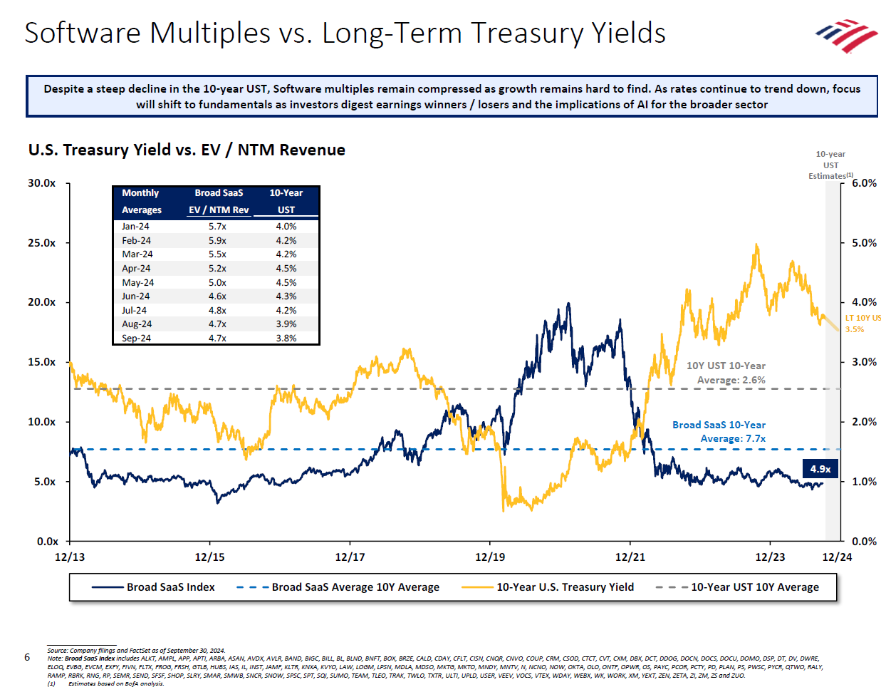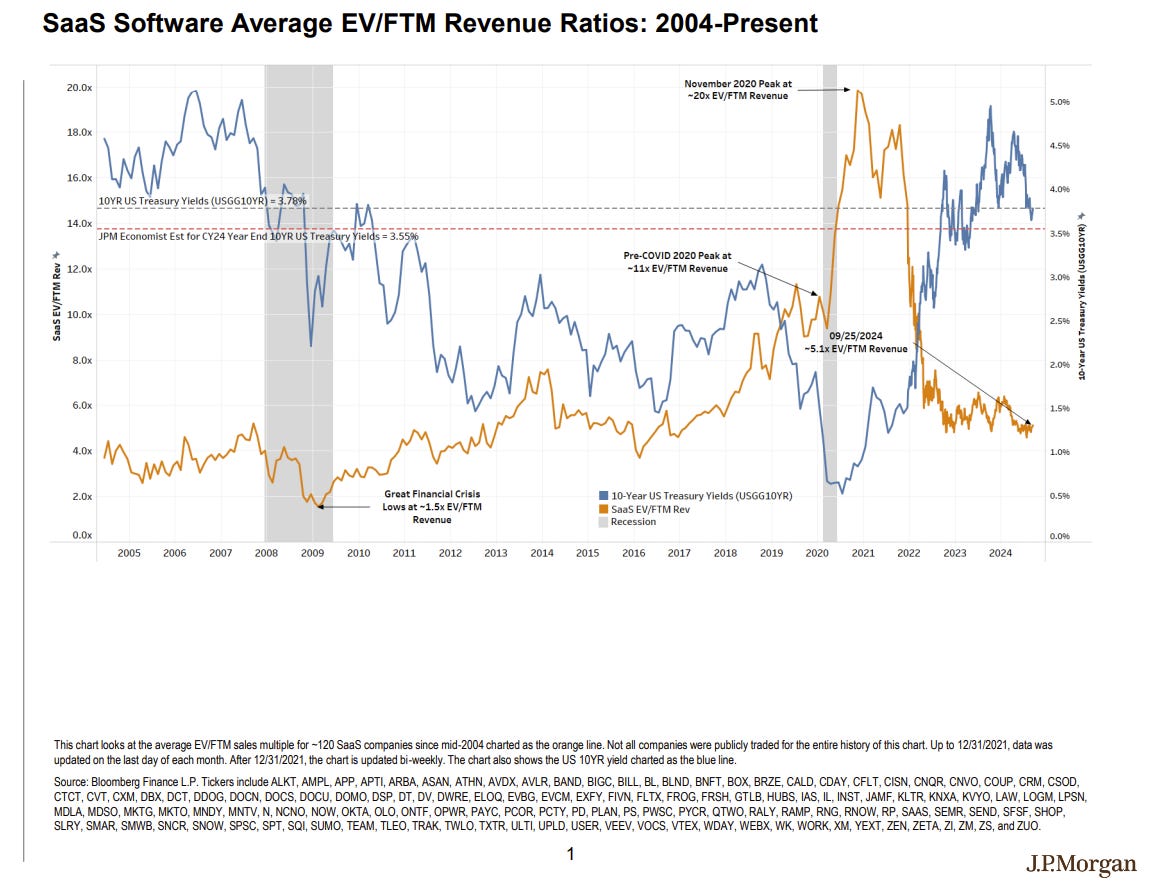 While this major turning point in monetary policy is cause for celebration, I caution software investors from fully rejoicing just yet. Diving deeper into the most recent period indicates that despite declining 10-yr US Treasury yields (falling to under 4% in August 2024), SaaS multiples have remained somewhat flat, which is an unexpected observation based on the conventional wisdom described earlier: