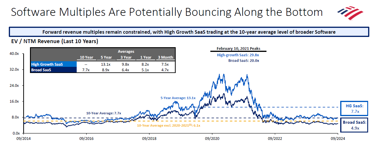Will multiples bounce back to historical averages or should we be underwriting to a new normal if high-growth SaaS today is trading at the 10-year average level of broader software (chart below)?