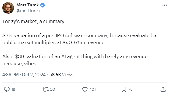 Yet, looking at recent examples highlighting the current investor exuberance for AI companies indicates that AI valuations don’t always make a lot of sense (as Matt Turck from First Mark quips in his tweet above). The trend suggests that some VCs are perhaps underwriting to either unprecedented multiples and/or extraordinary fundamentals and/or lower return hurdles to support these astronomical marks.