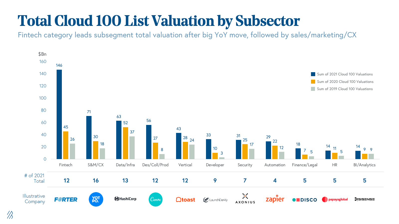 Fintech surpassed data infrastructure as the most valuable Cloud 100 category, though sales, marketing, and customer success software continues to have the plurality of companies on the list. With 16 companies, the Sales/Marketing/CX category was the largest category represented on the 2021 Cloud 100 list by company count, including such notable names as Attentive, Yotpo, and Intercom, and it was the second most valuable subsector with $71 billion of value. However, the data changes when looking at aggregate valuation by subsector. With only 12 fintech companies on the list, this subsector holds 28% of the list’s equity value at $146 billion and is the highest valued subsector, anchored by Stripe (18% of the list’s value alone).