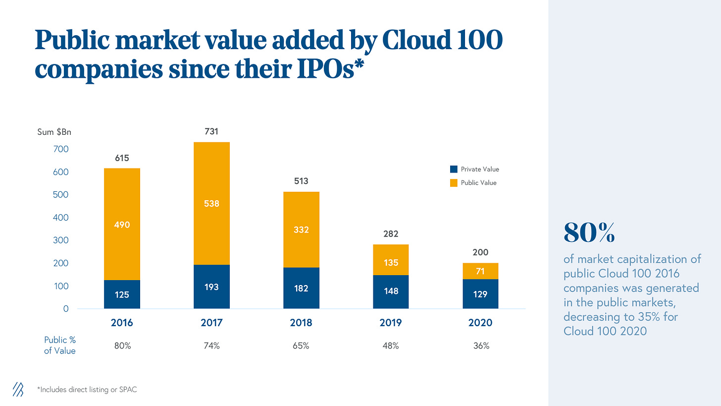 Looking into the value creation of public Cloud 100 companies from 2016, \~80% was generated in the public markets, with \~70% for 2017-2018; however, it is noteworthy that the 2019 and 2020 lists have materially less public contribution. Naturally more value will be captured in the public markets as these companies grow in revenue and in their valuations, but given the dynamic of increased multiples in the private markets, there is an argument to be made that companies are now capturing value in the private markets that historically was only reserved for the public markets.