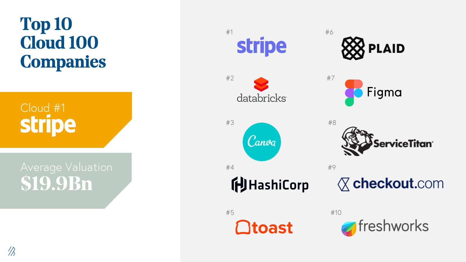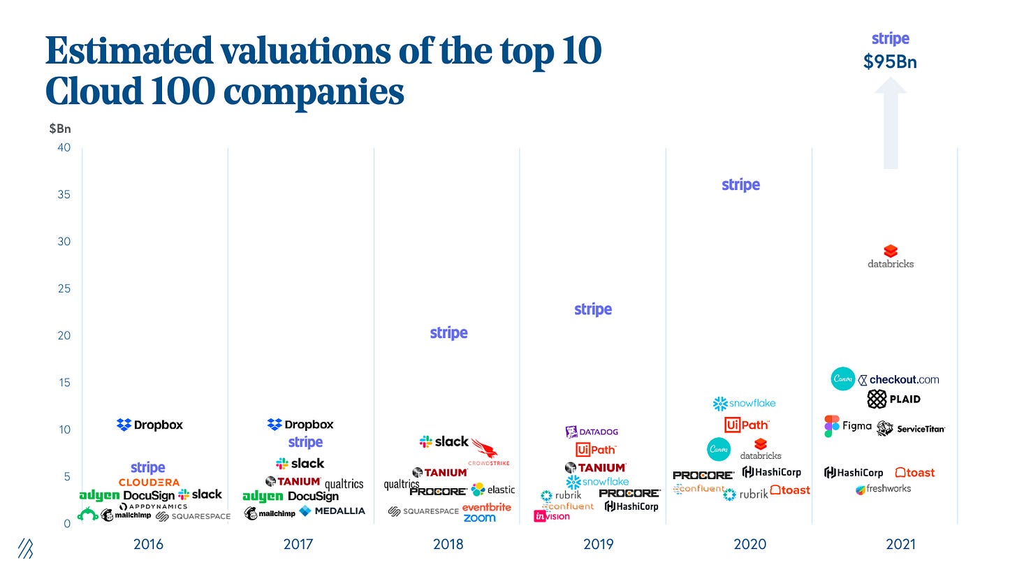 Today Bessemer Venture Partners, Forbes, and Salesforce Ventures announced the 2021 Cloud 100 List, the definitive ranking of the top 100 private cloud companies. And — keeping consistent with previous years’ trends — the 2021 list was even stronger than the last. This year features bigger companies, higher valuations, and more market tailwinds than ever before — so much so, in fact, that the estimated valuation required to make the list was over $1 billion*. That’s right. The bar for this year’s list was so high that each honoree achieved the unicorn milestone. Between Stripe at $95 billion, Databricks at $28 billion, and Checkout at $15 billion, to get on the 2021 Cloud 100 list was a fight among giants. These honorees truly represent the best cloud companies globally.