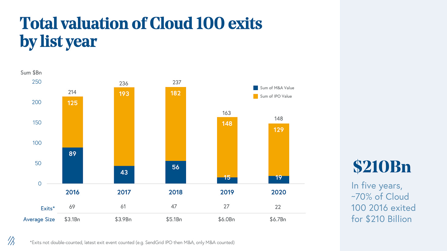 Much of the strong Cloud 100 returns — especially in the last year — have been driven by today’s strong market and exit environment for cloud companies. Almost 70% of the Cloud 100 2016 has exited, for an aggregate of $210 billion, while the average exit value has increased from $3Bn then to over $6.7Bn in 2020. Across the entire universe of 234 companies that have ever been on a Cloud 100 list, 86 companies (or 37%) have exited for a total of over $300 billion.