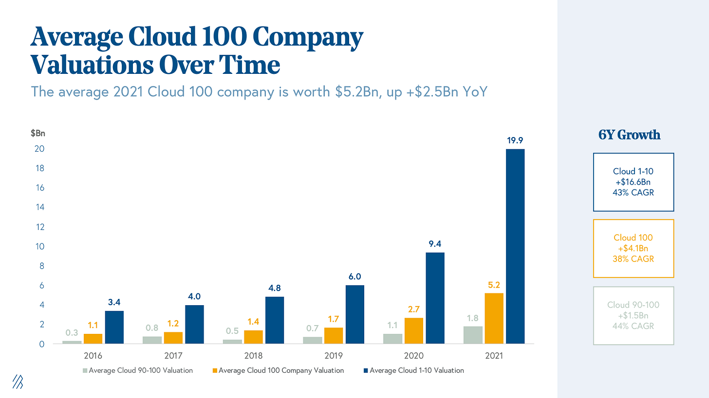 The threshold to make the Cloud 100 continues to get higher: this year, every company on the list has at least hit the unicorn milestone. In addition, the average cloud company valuation was $5.2 billion, an increase of $2.5 billion YoY.