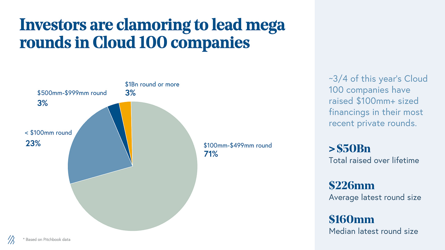 Investor excitement for strong cloud businesses has led to the growth in mega-rounds in Cloud 100 companies. Three-quarters of this year’s Cloud 100 companies have raised $100 million or more in their most recent financing rounds, with the average latest round size of a Cloud 100 company exceeding $225 million. Cumulatively, the Cloud 100 2021 basket has raised more than $50 billion over its lifetime!