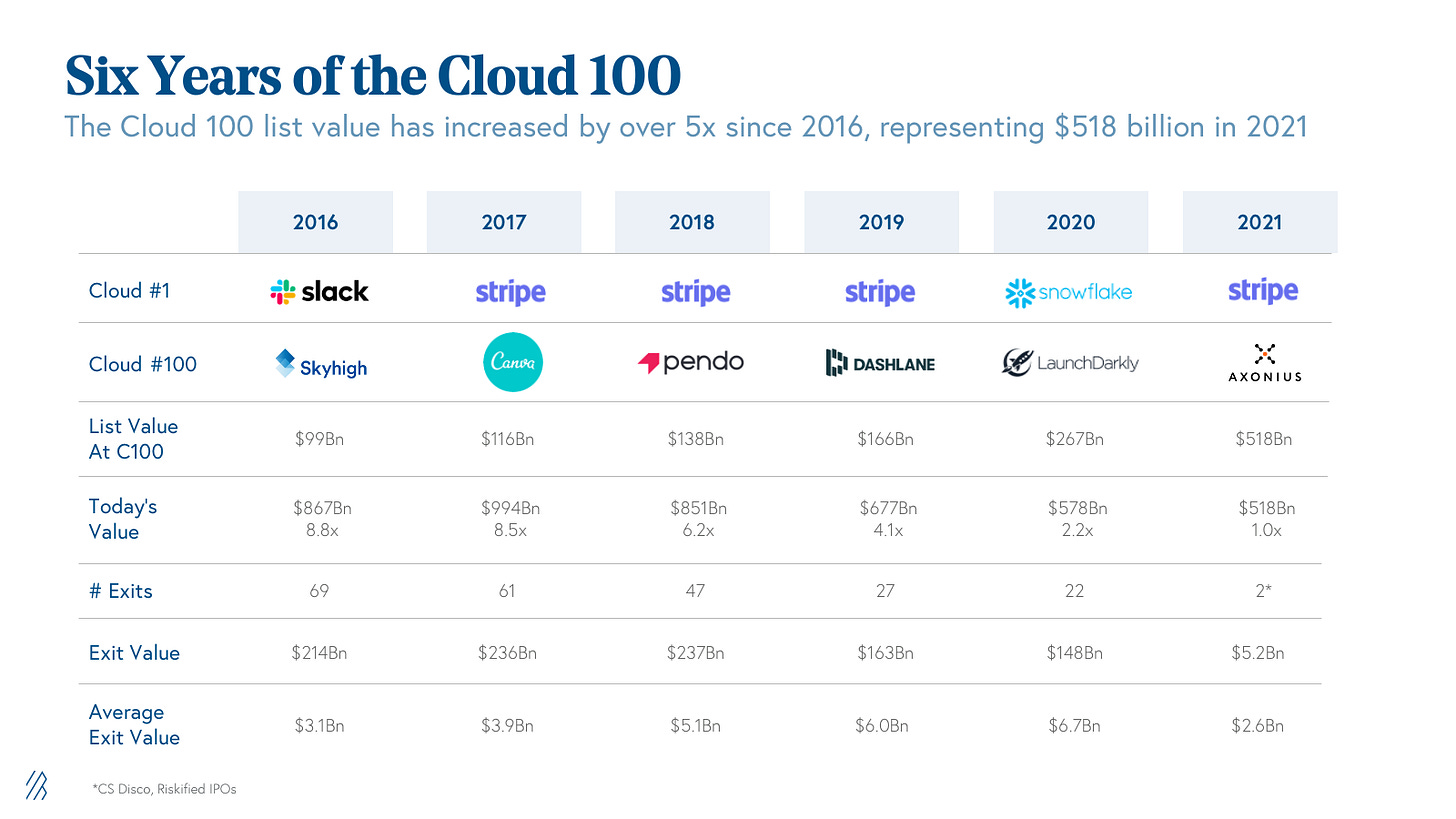 For founders, the takeaway is that building a cloud business today is as valuable as it has ever been before. The combination of unprecedented growth rates and increased investor demand have led to a proliferation of Cloud 100 unicorns.