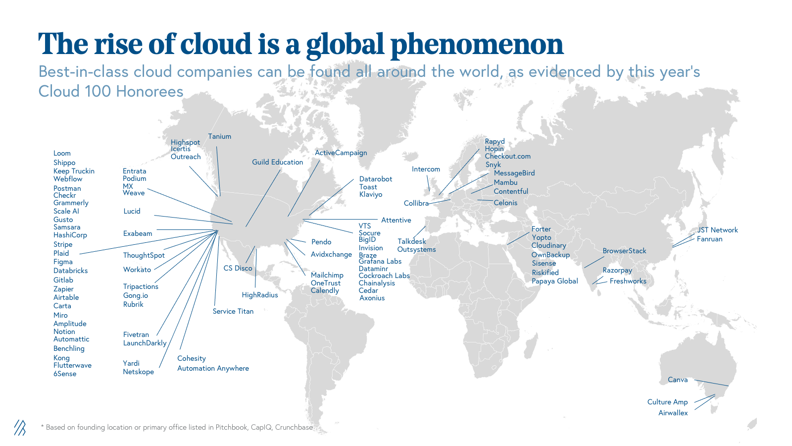 The globalization of cloud continues. As entrepreneurs, operators, and investors all around the world increasingly recognize the power of the cloud, we’re seeing cloud startups bloom in technology hubs globally. The Cloud serves as the backbone for emerging tech communities across the globe as startup teams have more flexibility and agency than ever before. In the Work from Anywhere movement, we’ve found that remote-first and distributed cloud teams across North and South America, EMEA, and APAC experienced more efficiency, increased scalability, and higher access to diverse pools of talent from all around the world. International representation on the Cloud 100 list reached almost 30% this year, and we expect this trend to continue for many more years to come, making the Cloud 100 more and more geographically diverse. We believe entrepreneurship is borderless, and we’re excited to continue to back cloud entrepreneurs around the world, from Canva in Australia to Mambu in Germany!