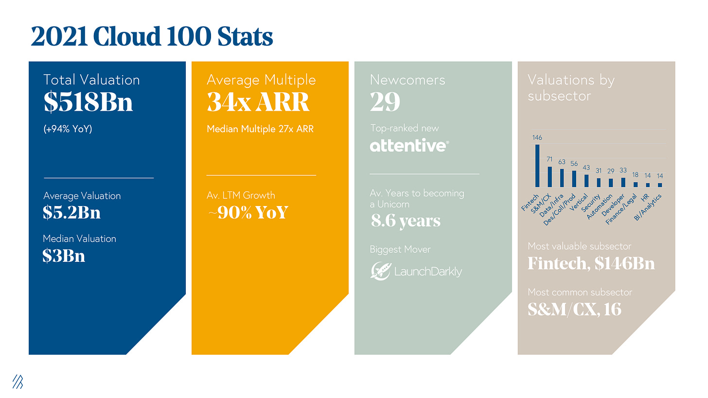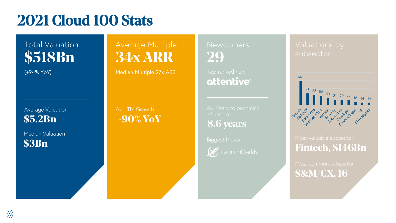 The 2021 Cloud 100 list represents an astonishing $518 billion of equity value, with an average $5.2 billion valuation per company. The cumulative value of the Cloud 100 list is up a staggering +94% from the 2020 list’s aggregate value of $267 billion, in just one year.