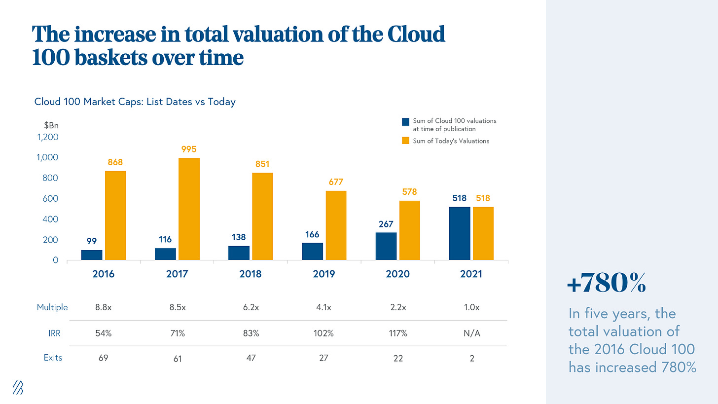 The Cloud 100 list continues to produce strong returns. In five years, the total valuation of the 2016 Cloud 100 list has increased by more than 780%, delivering an 8.8x and 54% IRR in that time. The 2017 Cloud 100 basket has delivered an 8.5x and 71% IRR as its aggregate value nears $1 trillion; the 2018 basket a 6.2x and 83% IRR; the 2019 basket a 4.1x and 102% IRR; and the 2020 basket a 2.2x and 117% IRR in just one year alone.